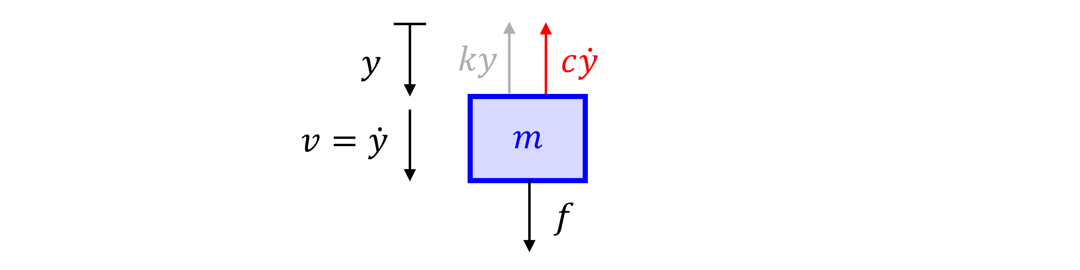 Next we apply Newton’s second law of motion \begin{aligned} \sum F_y &= m a = m \ddot{y} \\ &= f(t) - k y - c \dot{y} \end{aligned}