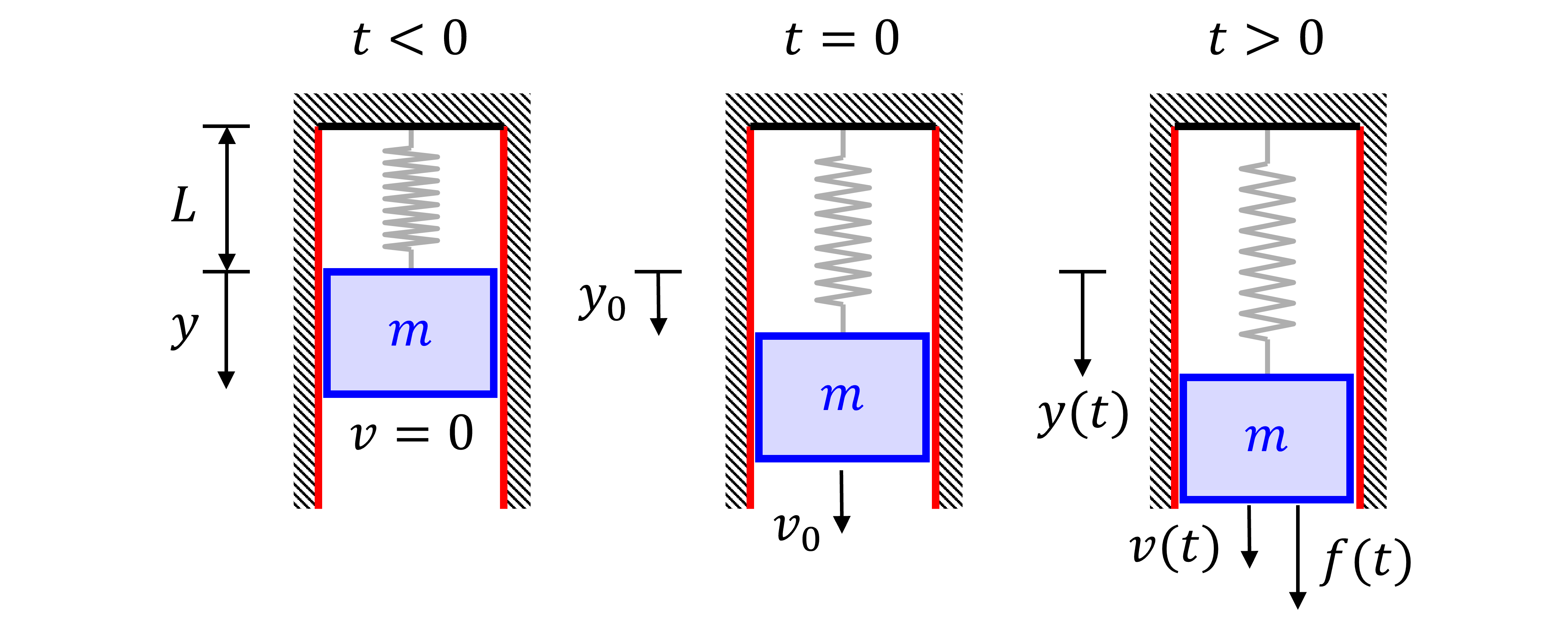 Figure 2 shows the MSD system at three different states: when the mass is at rest t<0, the motion’s initial conditions t=0, and once motion begins t>0.