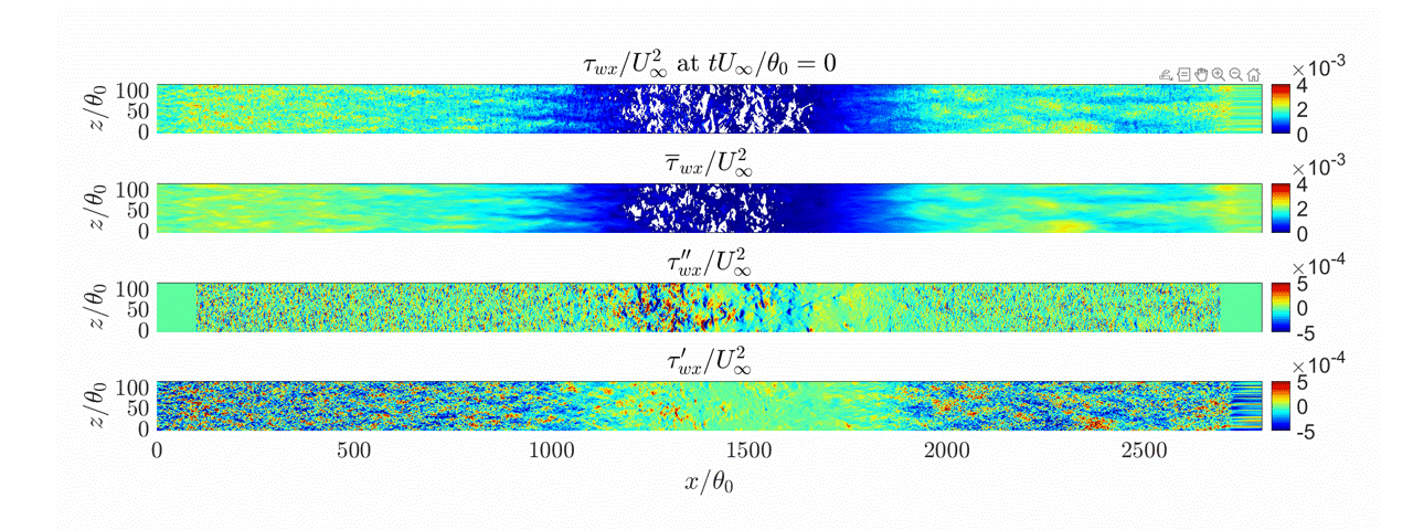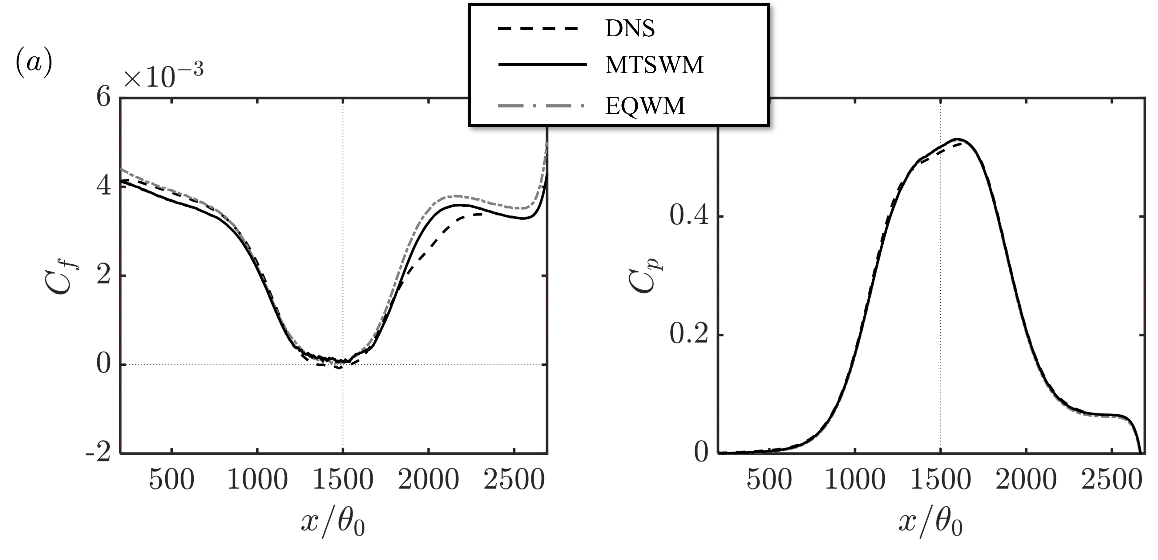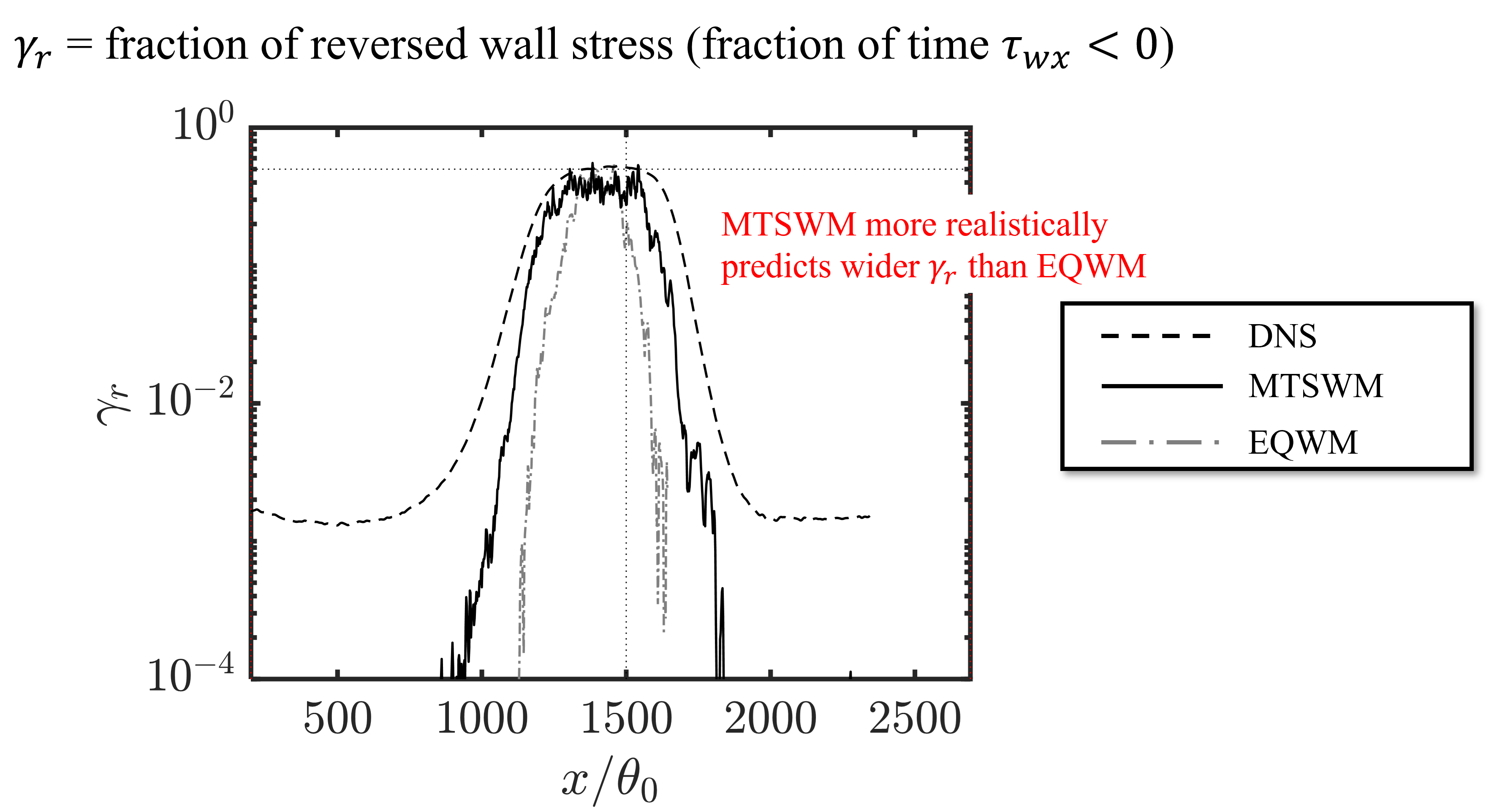 Figure 22 shows the skin friction for the MTSWM compared with the DNS of Coleman et al. (2018) and the baseline EQWM. All three curves are quite similar, however, both the MTSWM and the EQWM do not predict separation. Figure 23 shows the fraction of reversed wall stress, \gamma_r, (fraction of time the streamwise wall stress is negative). While the mean skin friction is never negative, instantaneously the wall stress is negative for both the MTSWM and EQWM. However the MTSWM gives a wider \gamma_r than the EQWM. In Figure 24 we see this is because of the additional fluctuation contributions from the lamNEQ model. The high frequency fluctuations in the LES pressure gradient drive small-scale wall stress fluctuations by the lamNEQ model. This creates the small intermittent separation patches (white regions) observed for the total wall stress for the MTSWM.