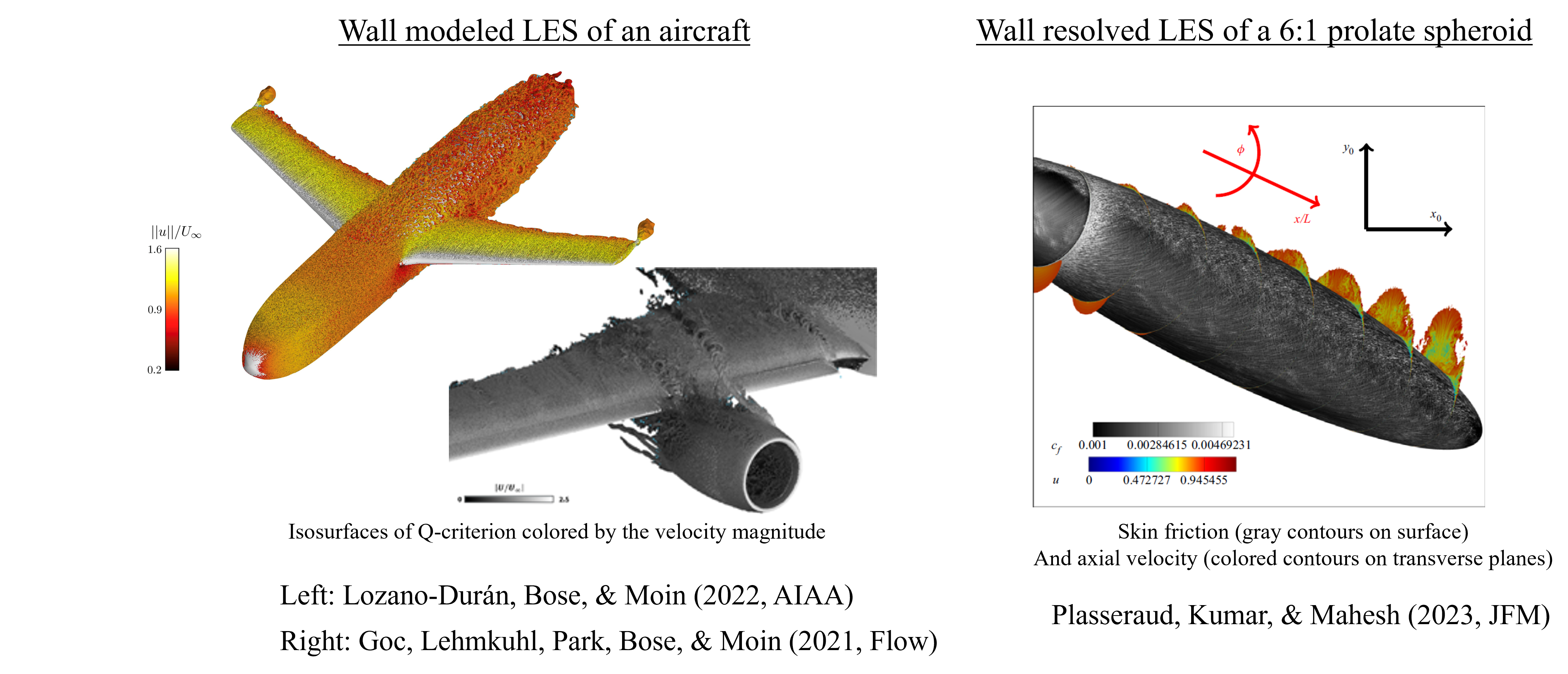 Large Eddy Simulations (LES) are becoming an increasingly relevant tool in engineering applications as computational abilities have improved. Figure 1 shows some LES engineering applications being pursued today. These include the aerospace industry where LES is being used to simulate flow over a full aircraft and wall resolved LES of a prolate spheroid, the canonical geometry for flow over Naval vehicles.
