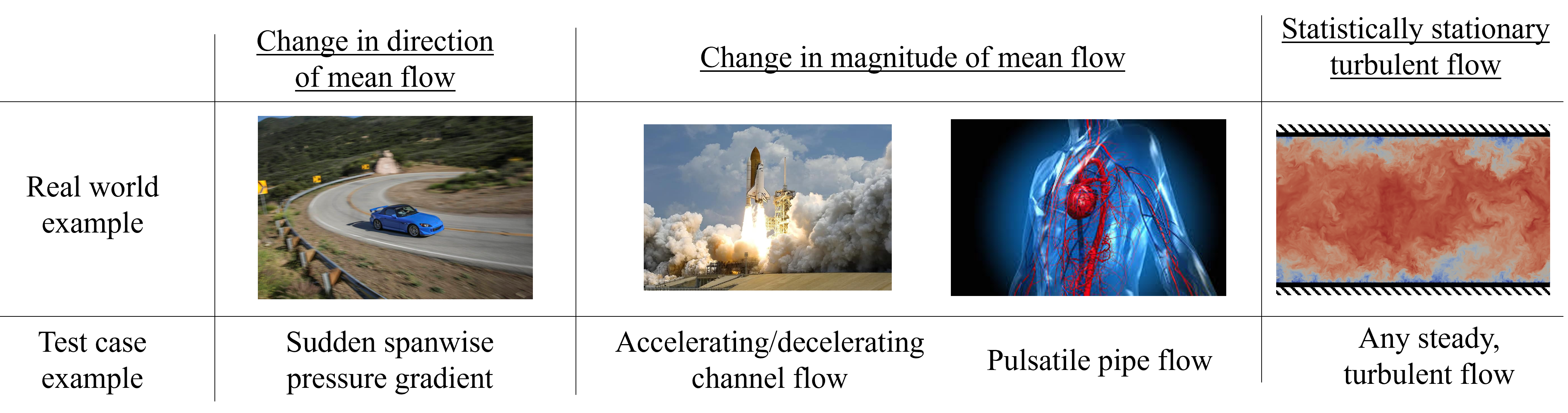 The focus of this research is unsteady or non-stationary flows. Figure 2 shows some real-world examples and their corresponding canonical test cases.