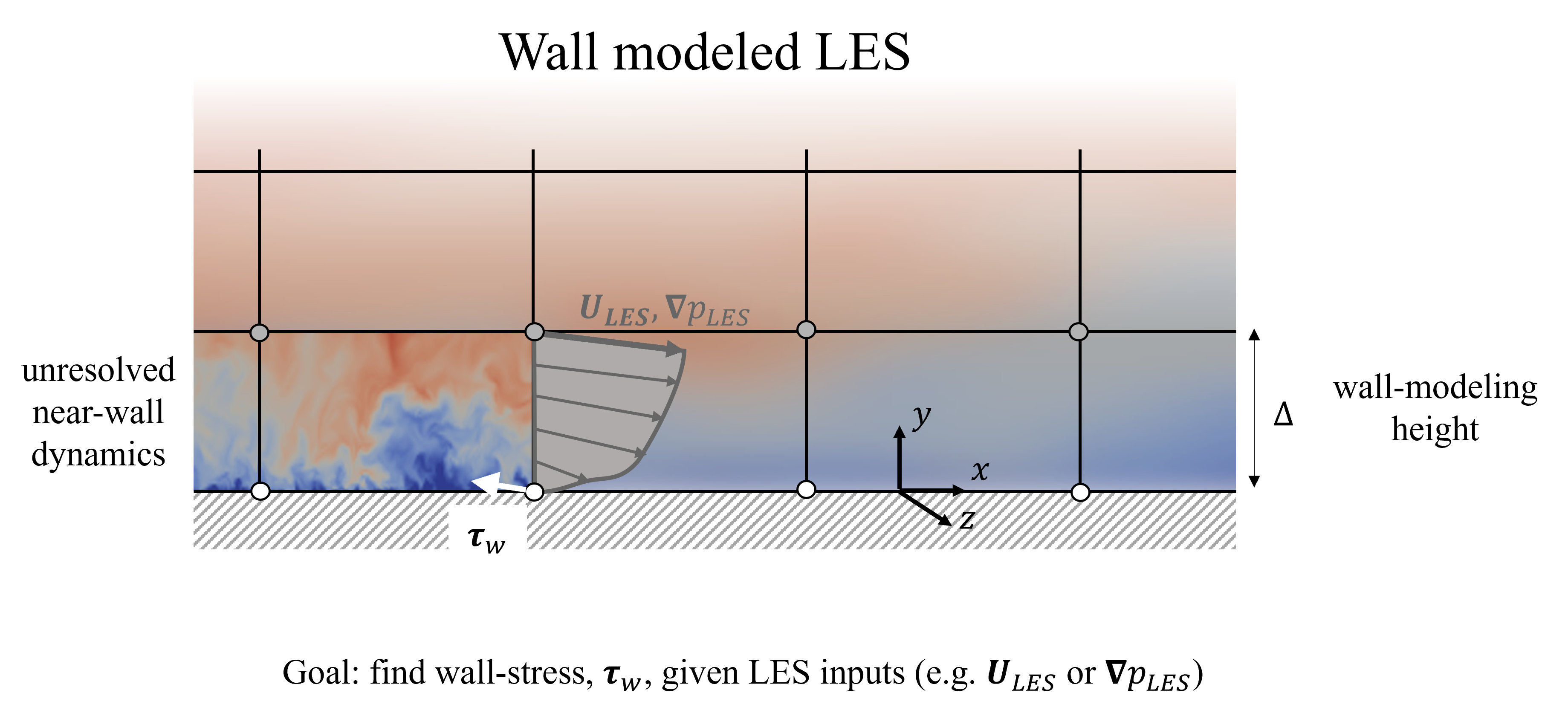 In wall modeling the goal is to replace the unresolved near-wall physics with a simplified model. This is typically done by utilizing known behavior (such as the law-of-the-wall) and relating the wall stress to LES inputs (like velocity and pressure gradient) located some height of the wall, called the wall modeling height. The modeled wall stress is then applied as a boundary condition to the LES. This general modeling concept is represented in Figure 4.