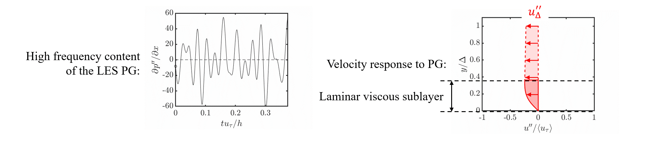 We then model the laminar non-equilibrium velocity \bm{u}'' by solving \frac{\partial \bm{u}''}{\partial t} = - \frac{1}{\rho} \bm{\nabla}_h p'' + \nu \frac{\partial^2 \bm{u}''}{\partial y^2}. The wall stress then has the solution {\color{red}\bm{\tau}_w''}(t) = \nu \left. \frac{\partial \bm{u}''}{\partial y} \right|_0 = \sqrt{\nu/\pi} \int_{t_0}^t - \frac{1}{\rho}\bm{\nabla}_h p''(t') \,\, (t - t')^{-1/2} dt'. \tag{3}