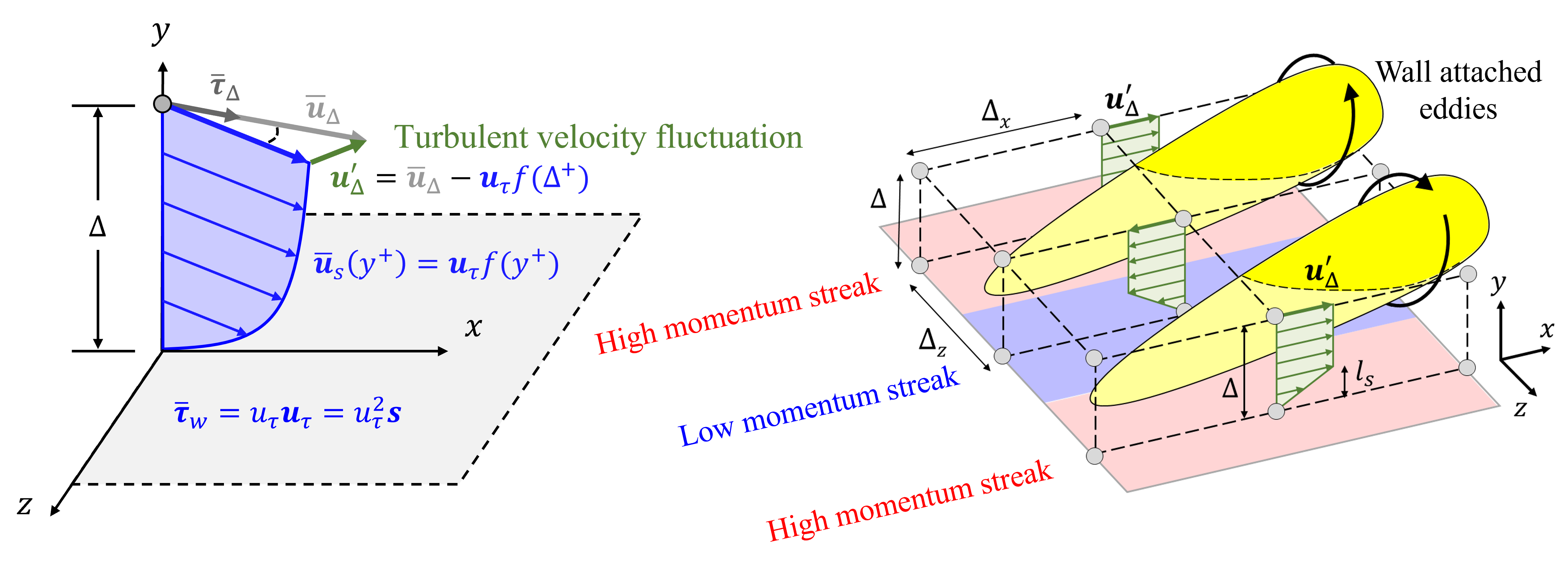 The final component is the turbulent non-equilibrium (turbNEQ) model. This model attempts to account for the velocity difference between the LES velocity and the LaRTE and lamNEQ models {\color{green}\bm{u}_\Delta'} = {\color{gray}\overline{\bm{u}}_\Delta} - {\color{blue}\bm{u}_\tau f(\Delta^+)} = \bm{U}_{LES} - {\color{red}\bm{u}_{\Delta}''} - {\color{blue}\bm{u}_\tau f(\Delta^+)}. The turbNEQ model assumes that the velocity fluctuation, \bm{u}_\Delta', comes from near-wall turbulent flow structures such as wall attached eddies as shown in Figure 11.