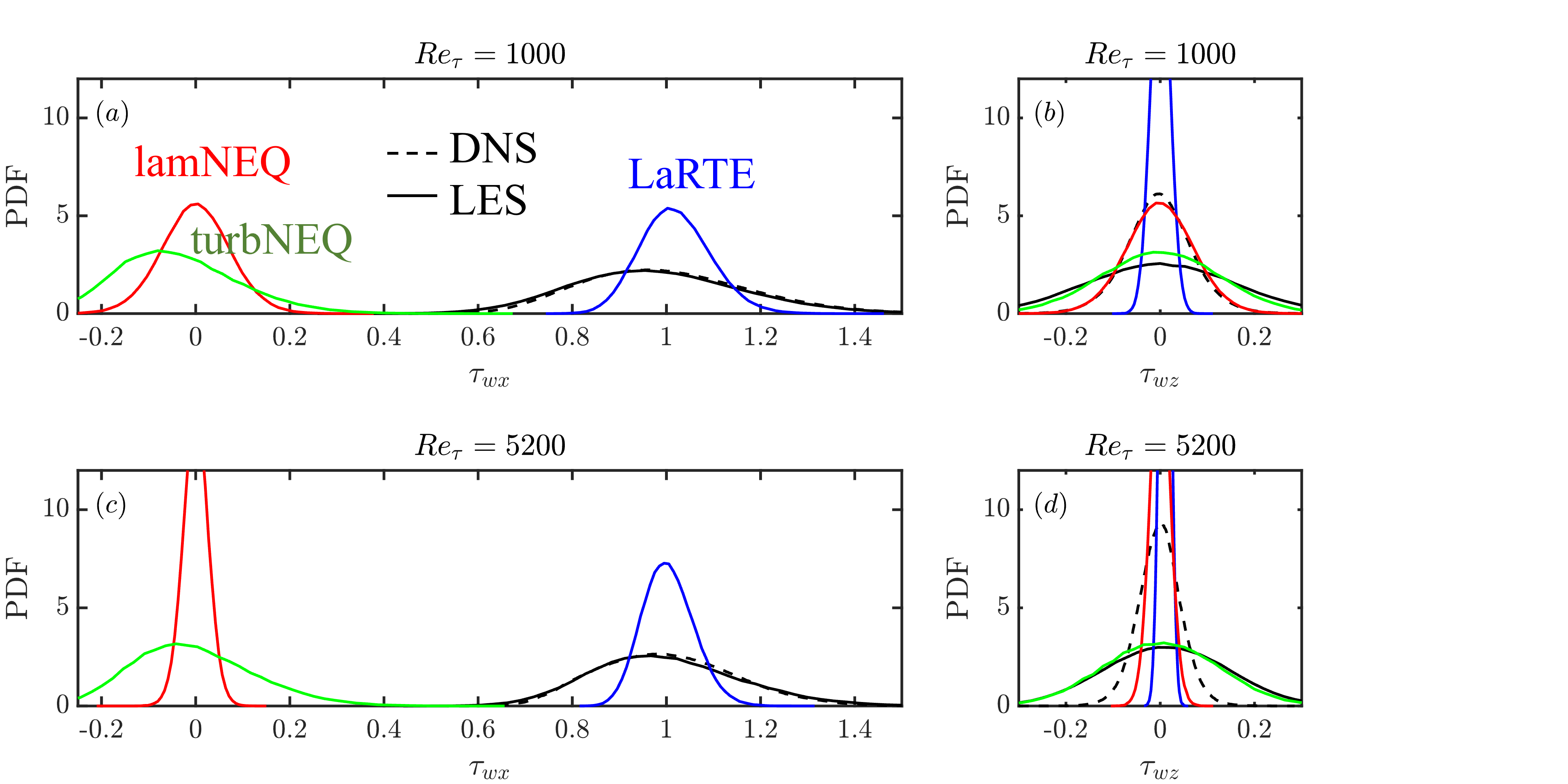 First the MTSWM is applied to channel flow. Figure 12 shows the wall stress probability density functions (PDFs) for stationary channel flow with Re_\tau = 1000, 5200. Agreement between the LES with MTSWM and the DNS is very good for the streamwise PDFs although too wide for the spanwise PDFs. The turbNEQ model is able to properly capture the bulk of the streamwise wall stress fluctuations and the LaRTE model capture the mean. This is consistent with the turbNEQ model capturing near-wall turbulent fluctuations and the LaRTE model capturing the mean behavior. For larger Reynolds numbers the lamNEQ model has a very narrow PDFs due to its \sqrt{\nu} scaling.