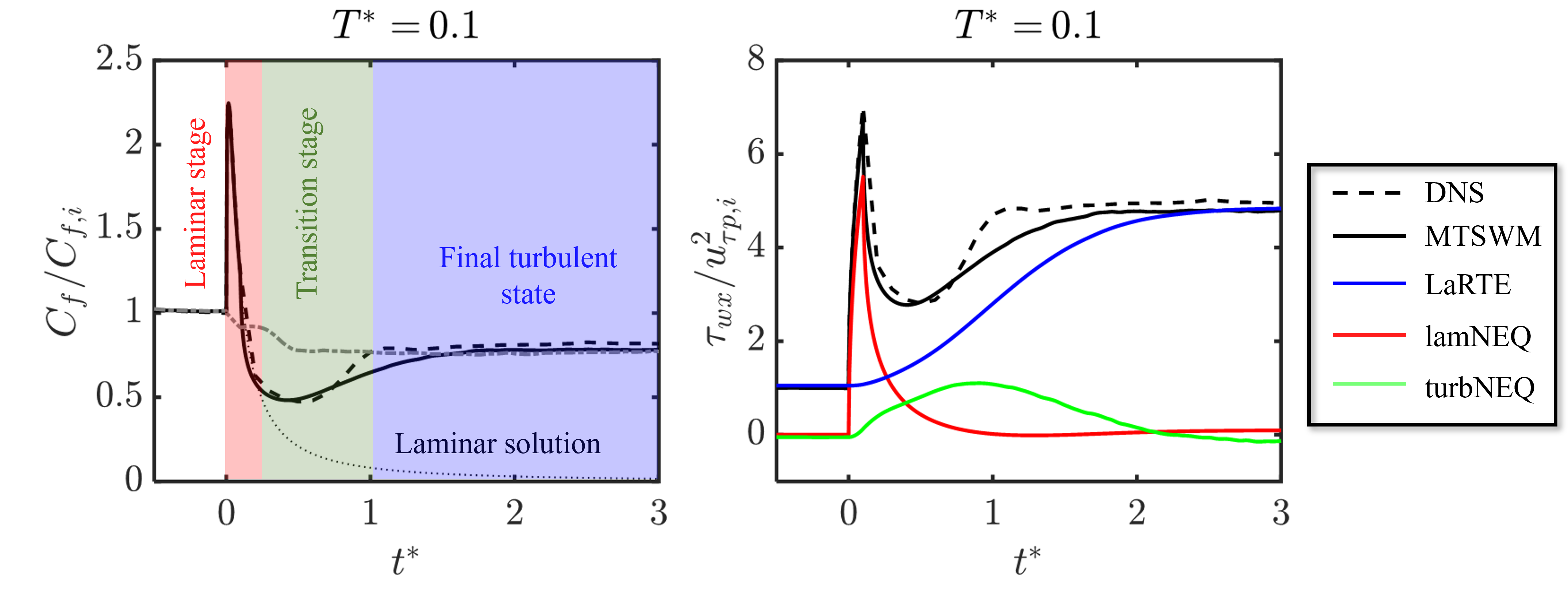 When plotting the different model components of the MTSWM (right subplot of Figure 16) we can see that the different model components are “activated” during each of the stages. The LaRTE model captures the mean wall stress before acceleration and after the flow reaches its final turbulent state. The lamNEQ model captures the quick spike in the skin friction during the laminar stage. And the turbNEQ model slowly increases the skin friction during the transition stage.