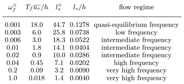 First is pulsatile channel flow. The flow is generated by a sinusoidal pressure gradient forcing \frac{\partial P}{\partial x} = \frac{\partial P_0}{\partial x} \left[ 1 + \beta \cos \left( \omega_f^+ t^+ \right) \right]. \omega_f^+ is the non-equilibrium parameter of interest and dictates the different flow regimes outlined in Figure 13 below.