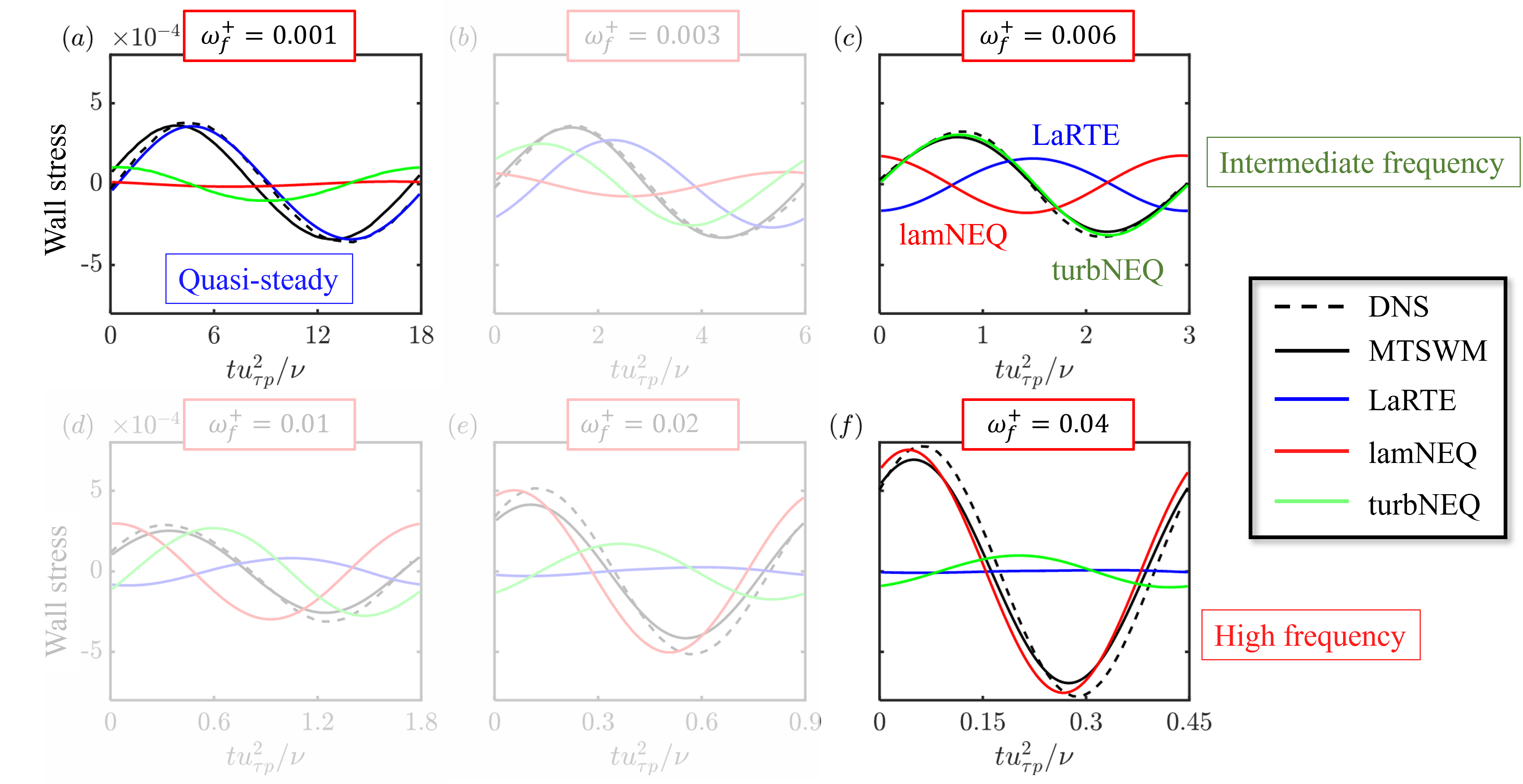 The MTSWM is tested for this flow and compared against the DNS of Weng et al. (2016). Figure 14 shows the period wall stress (obtained using a triple decomposition) for the full range of frequencies. The MTSWM results agree quite well with the DNS for each of the forcing frequencies. The quasi-steady, intermediate, and high frequencies are highlighted to show how the different modeling components are engaged during the different flow regimes. The LaRTE model captures the slow, quasi-steady dynamics, the turbNEQ model captures the intermediate frequency dynamics, and the lamNEQ model captures the fast, high-frequency dynamics. This is consistent with the time scale schematic of Figure 5.