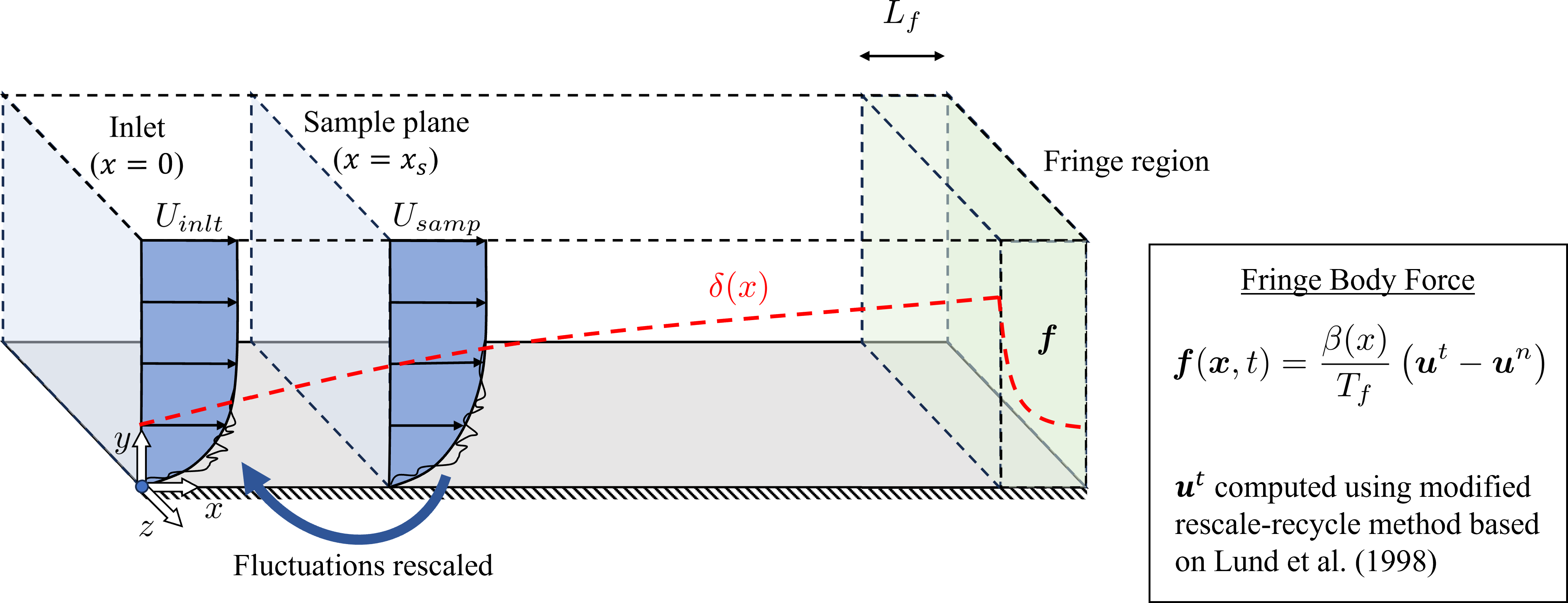 First the zero pressure gradient turbulent boundary layer (ZPGTBL) is simulated. The wall model is implemented in JHU’s LESGO code which needed modifications in order to handle spatially developing flows. To simulate a developing boundary layer the rescale-recycle method by Lund et al. (1998) is implemented in order to achieve a turbulent inflow. The fluctuations downstream of the inlet are sampled, rescaled, and recycled to the inlet. A schematical picture of this is shown in Figure 17. Because LESGO is periodic, a fringe region is needed to reduce the boundary layer at the outlet and re-introduce it at the inlet. This is done via a body force (the body force formula is also privided in Figure 17).