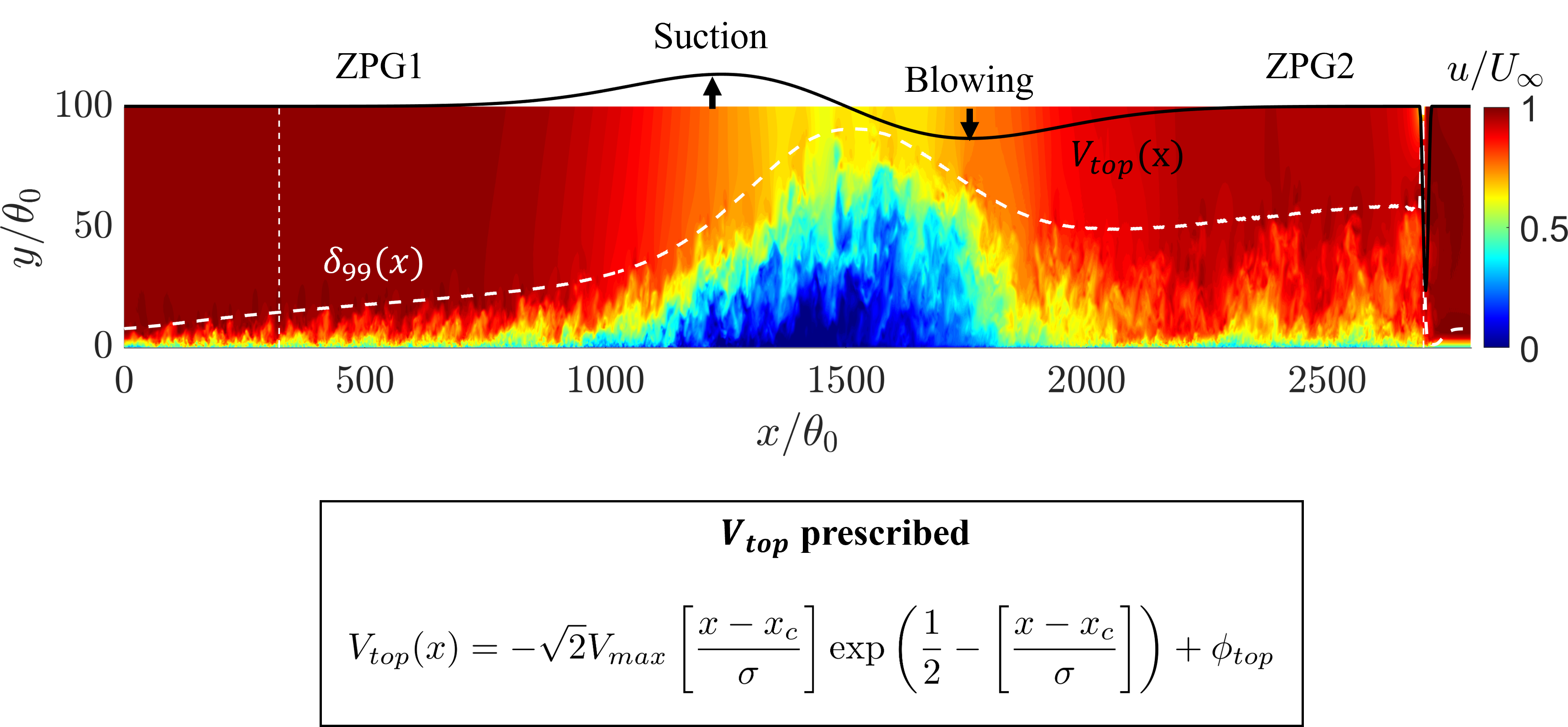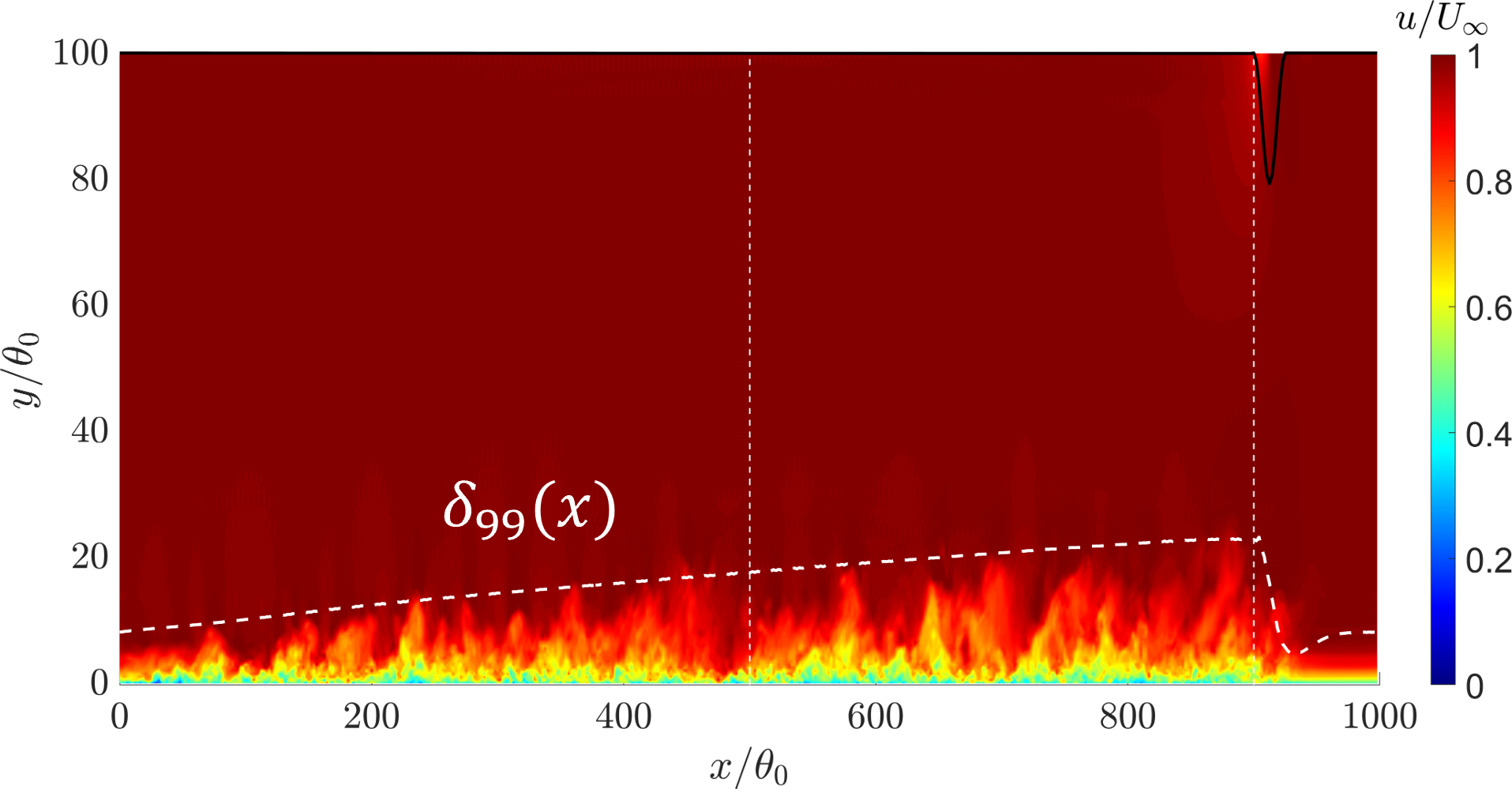 Finally, the MTSWM is applied to a separated turbulent boundary layer (TBL) based on the simulation setup of Coleman et al. (2018). The flow set-up and resulting instantaneous velocity field is shown in Figure 21. A separation bubble is formed by imposed suction (adverse pressure gradient) and blowing (favorable pressure gradient) on top boundary of the domain. This produces a weakly separated boundary layer at the center of the domain.