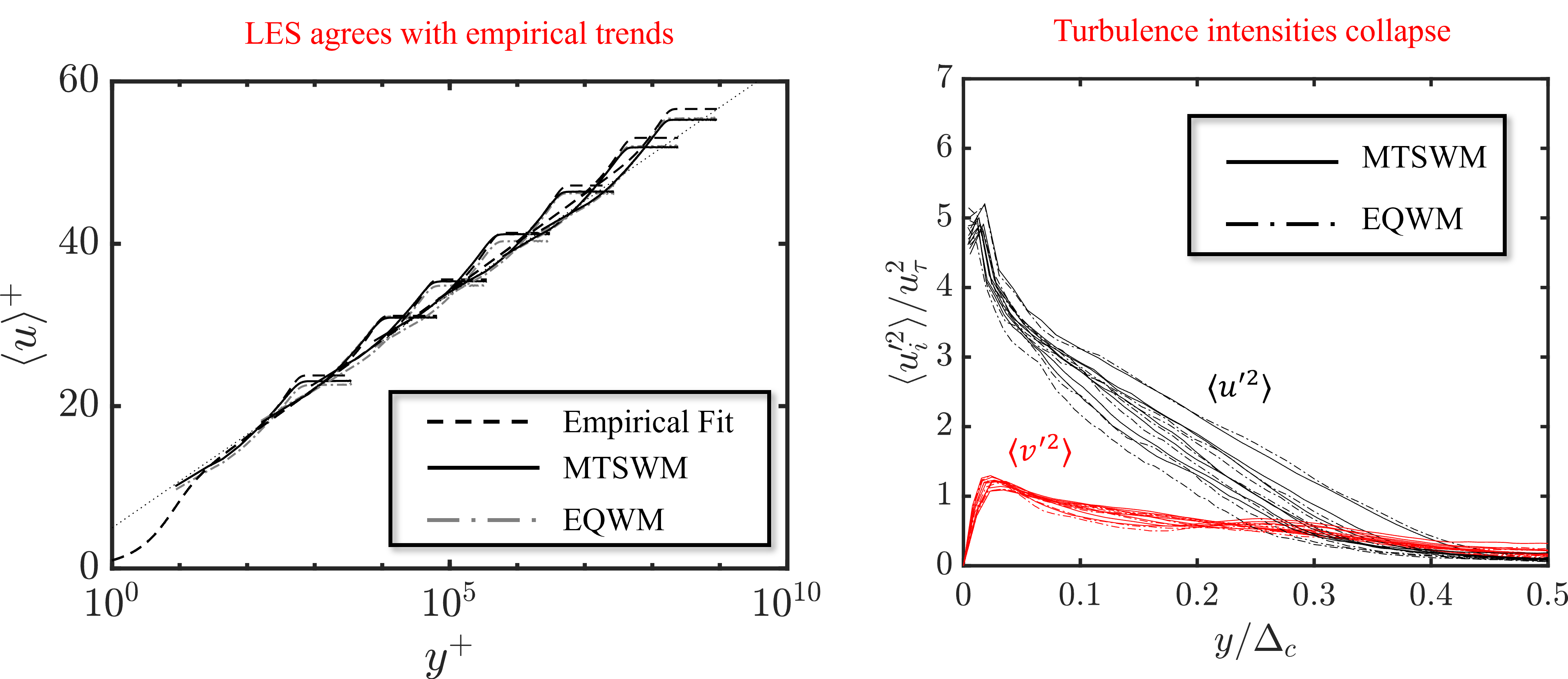 The most widely used wall model is called the equilibrium wall model (EQWM), named so because it assumes shear stress are in equilibrium in the wall modeling region. The common approach is to assume the velocity profile follows the log-law U_{LES}/\tau_w^{1/2} = \frac{1}{\kappa} \log \left( \frac{\Delta \tau_w^{1/2}}{\nu} \right) + B and then to iteratively solve for the wall stress, \tau_w. This model, however, has been shown to perform poorly during non-equilibrium conditions. This led the development of the MTSWM, discussed next.