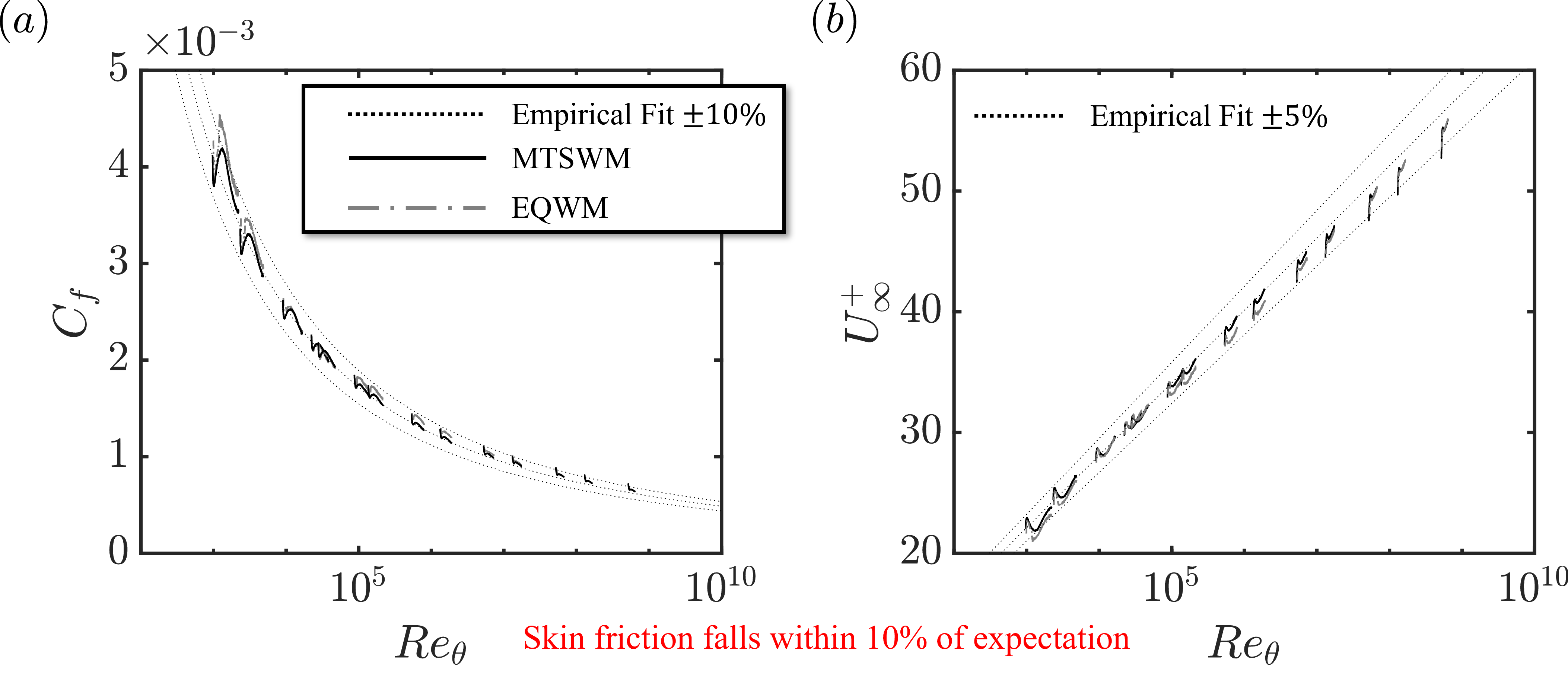 Adding the turbNEQ model now completes the time scale schematic shown in Figure 5. The full MTS model with LaRTE, lamNEQ, and turbNEQ parts is just the superposition of these different parts \bm{\tau}_w(x,z,t) = {\color{blue}\overline{\bm \tau}_w}(x,z,t) + {\color{red}\bm{\tau}_w''}(x,z,t) + {\color{green}\bm{\tau}_w'}(x,z,t) where {\color{blue}\overline{\bm \tau}_w}, {\color{red}\bm{\tau}_w''}, and {\color{green}\bm{\tau}_w'} are computed via Equation 2, Equation 3, and Equation 4, respectively. This model is now applied to a variety of flows to show the usefulness of this approach.